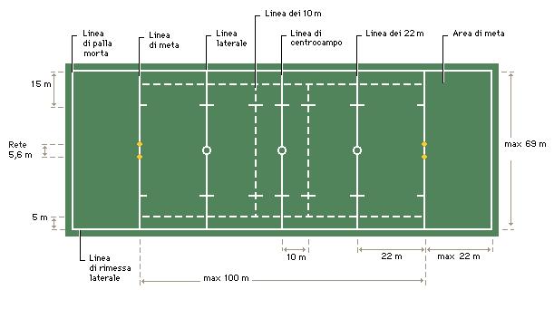 Sport di squadra che si gioca su un campo rettangolare (100 x 68 m), diviso in settori da linee bianche parallele ai lati più corti del campo. A metà delle due linee di fondo è situata una porta a forma di H allungata, sormontata da una traversa posta a un'altezza di 3 m e retta da due pali distanti 5,60 m. Oltre la porta e la linea di fondo campo, vi è una zona chiamata area di meta.