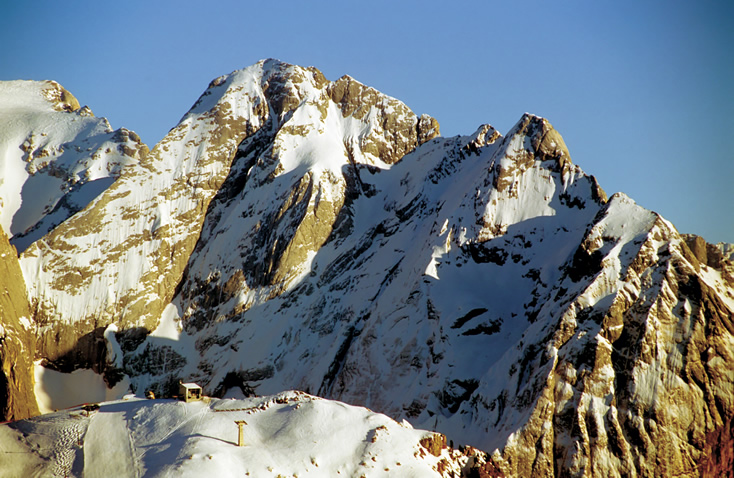 Una suggestiva veduta del gruppo della Marmolada, dominato dall'imponente ghiacciaio omonimo, che si estende per più di 3 km² sulla sommità. Appartenente alle Dolomiti, la Marmolada si eleva per un'altitudine massima di 3.342 m.